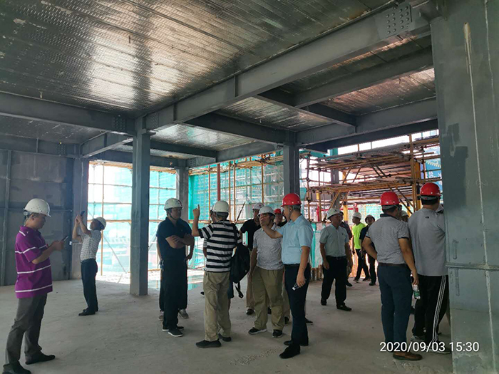 考察團主要了解桁架樓承板的區別及使用部位、陽(yáng)臺及衛生間縱向止水鋼板防滲漏、 鋼柱防火涂料與墻板的搭接節點(diǎn)處理等施工細節,及ALC墻板的施工工藝。我司方總重點(diǎn)向考察團介紹了本項目采用的鐵木辛柯-隱式鋼框架結構體系,裝配率滿(mǎn)足政府申報裝配式住宅要求,且具有無(wú)凸梁凸柱、空間利用率高、得房率高的優(yōu)勢。