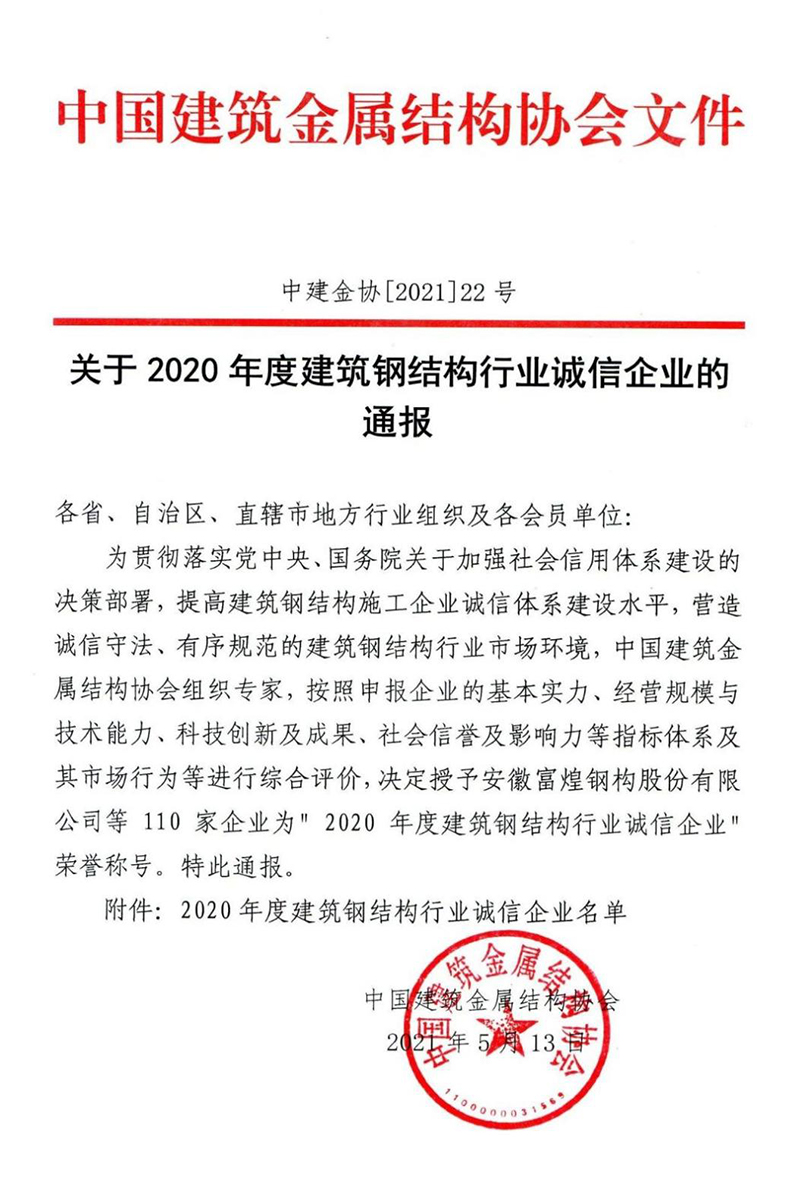 【表彰公告】關(guān)于2020年度建筑鋼結構行業(yè)誠信企業(yè)的通報