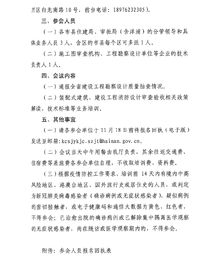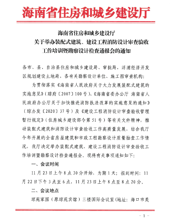 海南省住房和城鄉建設廳關(guān)于舉辦裝配式建筑、建設工程消防設計審查驗收工作培訓暨勘察設計檢查通報會(huì )的通知