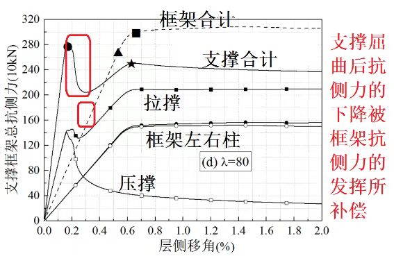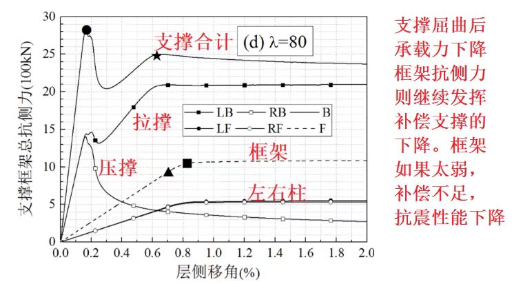 圖4 框架25%支撐75%,長(cháng)細比80時(shí)(各構件對抗側力的貢獻拆分出來(lái)看)