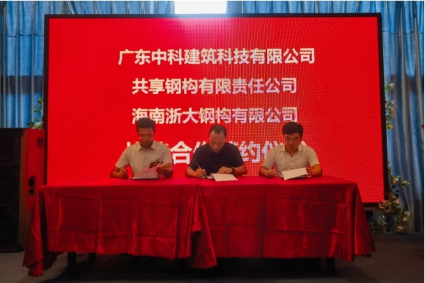 2024年6月15日,海南浙大鋼構有限公司、共享鋼構有限責任公司與廣東中科建筑科技有限公司鋼筋桁架樓承板三方戰略合作簽約儀式在?诔晒εe行。浙大鋼構總經(jīng)理方建平、共享鋼構常務(wù)副總葉偉標,中科建筑總經(jīng)理萬(wàn)飛翔等領(lǐng)導出席簽約儀式。